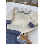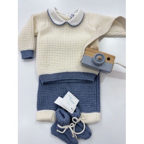 Brand: Bebè di Almy. Completino in lana, maglia panna con bordo sulle maniche e vita azzurro, collo con bodino azzurro, pantalone azzurro con dettagli panna, babbucce coordinate. 100% Lana merino. Made in Italy.