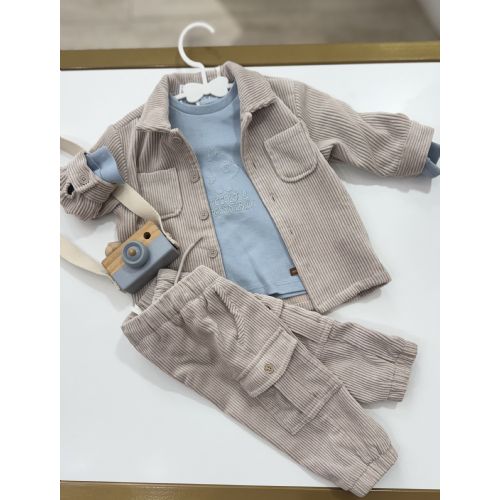 Brand: Minibanda. Completo 3 pezzi con camicia e pantalone in velluto tortora e maglietta in caldo cotone azzurro polvere maniche lunghe con polsini. Made in Portogal.
