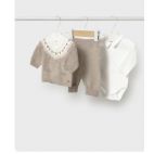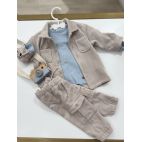 Mangione panna collo a V con due botone in cocco con tope sui gomiti e pantalone in velluto camel con tasche laterale. Maglione 80% cotone e 20% lana.Pantalone
