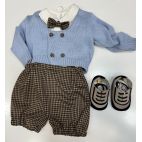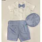 Completo cielo con camicia bianca ricamata, pantaloncino, papillon e coppola in tinta.
