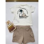 Completino con maglietta manica corta beige e fantasia sulla spallla e pantaloncino corto tortora. 100% cotone. Made in Italy.