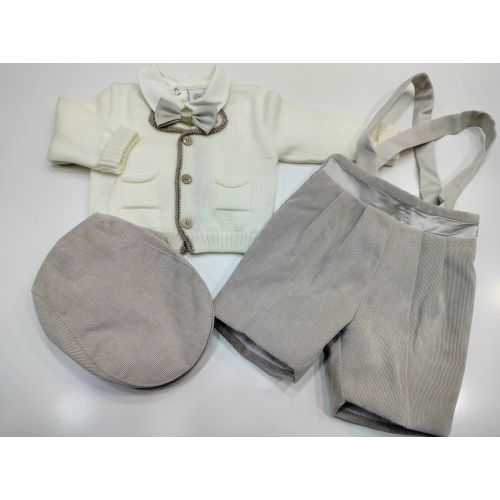 Completo Battesimo composto da camicia body in cotone Bamboo, papillon regolabile rasato, pantaloncino all'inglese in velluto a coste e bretelle rasata, cardigan in 100% lana con bordo a contrasto e coppola in velluto a coste. Articolo certificato e prodotto esclusivamente in Italia