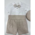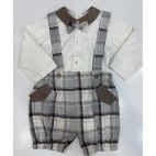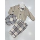 Completo elegante 4 pezzi, composto da : cardigan doppio petto con bottone rivestito in velluto millerighe color panna, camicina body in caldo cotone e collo in velluto millerighe, pantaloncino con bretelle effetto scozzese e papillon in tinta.