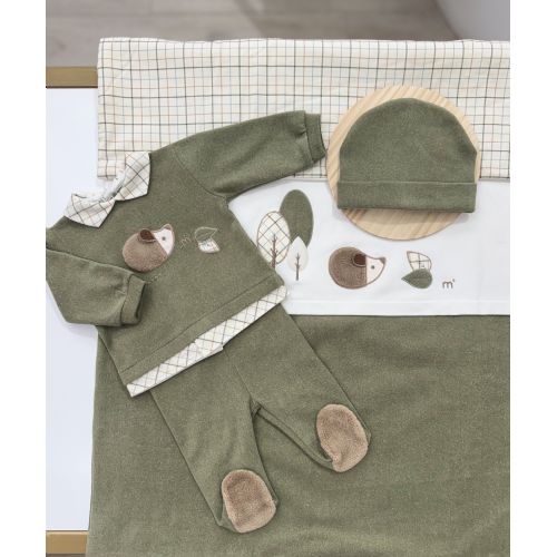 Coordinato nascita. Comprende: Completino con finta camicia a quadri, cappellino e copertina in ciniglia e caldo cotone.