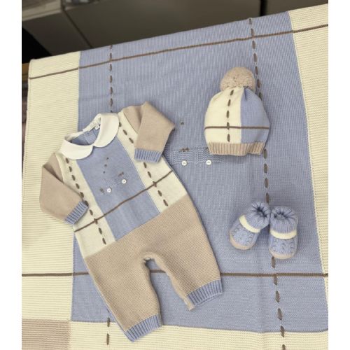 COORDINATO: Tema treno (colore azzurro/bianco/tortora). Tutina, cappello e babucce abbinata alla sua coperta che tiene una tramatura meravigliosa e unica con la sua particolarità como viene elaborata la lana rende una capo unico per la nascita di vostri piccoli. ci prendiamo cura di ogni capi. Offrende Prodotto artigianale 100 % lana pettinata. Made ITALY