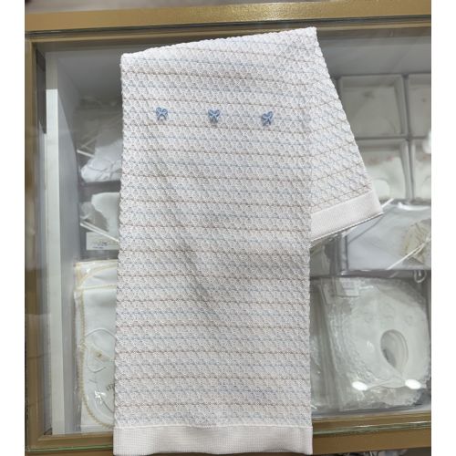 Brand: Marlú. Scialle in filo di cotone con Nodo D'amore. Colore: Bianco/ Cielo polvere / Noce. Coperta per carrozzina. 100% cotone. Made in Italy.