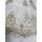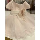 Vestina manica 3/4 in Macramé verde salvia con fiore laterali e fascia. Made in Italy.