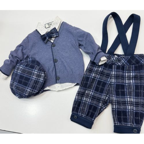 Completo elegante compreso di camicia a fantasia di cotone, pantalone tartan blu/azzurro alla zuava con bretelle, cardigan avion con bordo blu a collo a V e papillon abbinato e cappellino.