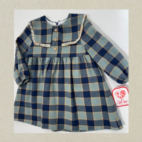 Vestina a quadrettone blu-verde acqua- effetto jeans con collo partecolare e bordino con fiorellini