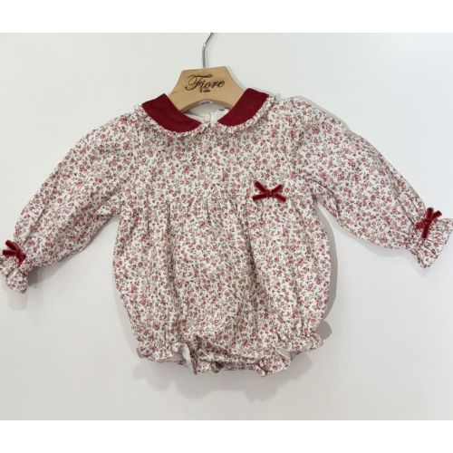 Pagliaccetto con fiorellini rossi e foglie verdi colletto in velluto rosso e bordino con plissett manica con punto smock e piccoli fiocchetti in velluto rosso, chiusura dietro con cerniera e sotto con bottoni Madre perla.