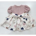 Vastina mezza manica in caldo cotone con corpetto rosa malva e tre fiocchetti, gonna a fantasia cuore e fiocco, vita un piccolo nastro in velluto blu dentro un po' di tulle che fa la ampiezza della gonna. Made in Italy.