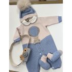 Tutina con cappellino e babbucce colore celeste e miele. 100% lana pettinata