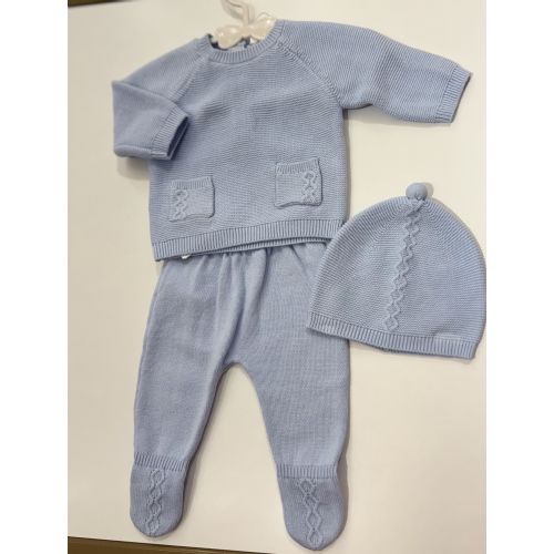 Completino in maglia spezzato cielo con cappello ricamato a triangoli piccolo pom pom. Caldo cotone