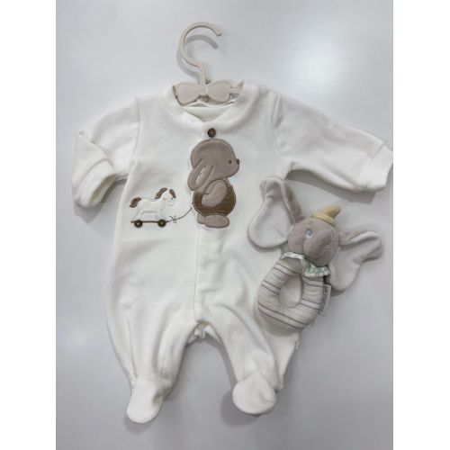 Tutina bianca con apertura avanti coniglio tortora e dondolo. Unisex.