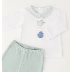 Tutina due pezzi con piede per neonato Minibanda. Il completo clinica è realizzato in jersey stretch di cotone. La maglietta ha il colletto, applicazione ricamo davanti e apertura dietro con bottoni a pressione. La ghettina ha l'elastico in vita ed il sotto dei piedini realizzato a contrasto colore.