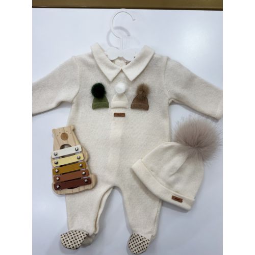 Tutina bianca in lanetta con tre cappellini sul petto ( verde - panna - marroncino e pelliccia sopra) e cappellino con pelliccia panna.