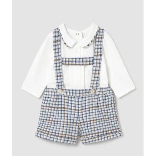 body manica lunga colletto modello camicia chiusura con bottoni a pressione nella parte posteriore.Pantaloncino con bretelle, elastico in vita. Dettaggio con orlo con risvolto. Motivo pied de poule.