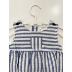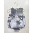 Brand: Deolinda. Pagliaccetto a giro maniche con righe orizzontali e verticali blu e bianco, bottoni sul retro. chiusura sotto le gambe con bottoni. 100% cotone. Made in Portugal.