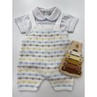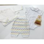 Brand: Marlú. Completino 3 pezzi: pagliaccetto, body e cardigan. Colore: Bianco/Cielo Polvere/ Multicolor. 100% cotone. Made in Italy.