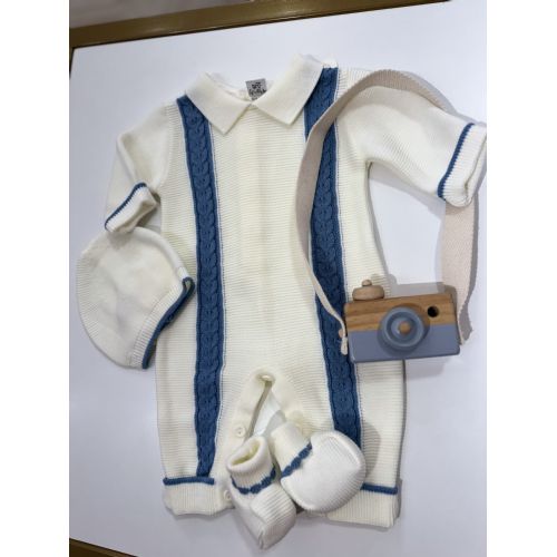 Tutina panna con trecce orizzontali avion il colore e più chiaro alla foto, cappello e babbucce coordinate. Misto Lana.