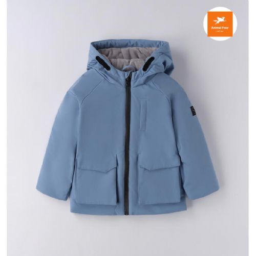 Giubbino per bambino azzurro realizzato in tessuto tecnico con interno foderato in parte,in caldo e morbido tessuto. Imbottittura in ovatta. modello con cappuccio e apertura con zip. Taschino interno. Animal freen