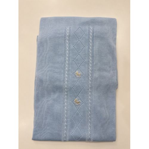 Brand: bebèmargò. Scialle in filo di cotone azzurro con elaborazione a trecce e rombi e piccoli cavallucci a dondolo. 100% cotone. Per passeggino. Made in Italy.