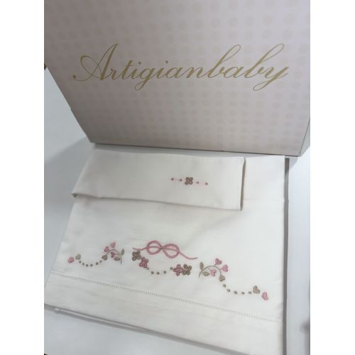 Lenzuola bianco per carrozzina con simbolo del infinito con piccoli cuori e fiorellini rosa e tortora. 100% puro cotone. Misure 90x120