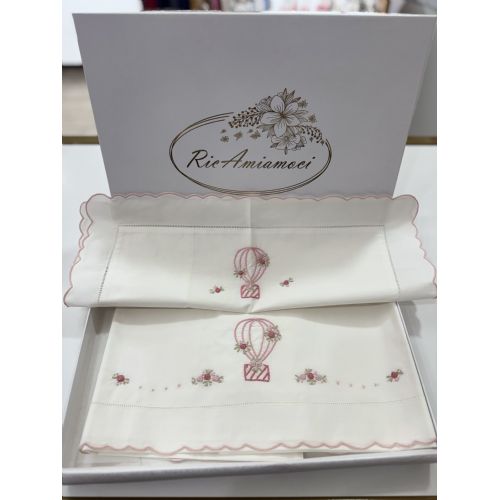 Lenzuola di cotone percalle con ricamo a mano mongolfiera. Comprende: sopra e fodera del cucino. Prodotto artigianale. 100% cotone. Misure: 90x120. Made in Italy.