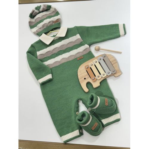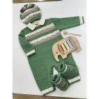 Tutina con colletto panna e righe ondulate panna/verde/tortora con cappello e babbucce coordinate. 100% lana pettinata Baruffa. Col:Panna-verde-beige. Alta qualità.