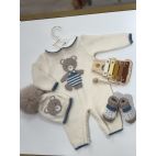 Tutina panna con orso al centro, cappellino con pelliccia vera e babbucce coordinate. Colori: Latte/Tortora/Verde Ottanio.