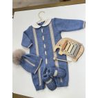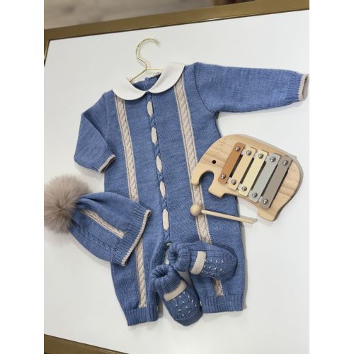 Tutina Denin con tramatura in trecce tortora, cappellino con pelliccia vera e babbucce.
