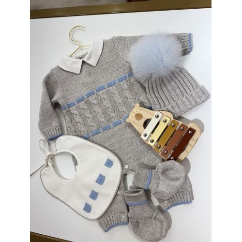 Tutina grigia con elaborazione in colore avion, cappellino con pelliccia vera , bavetta e babbucce. Tessuto doppio come filato Misto Lana. Made in Italy