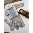 Brand: PRIMODì. Completino tema treno. Maglia con trenino tortora/azzurro/panna e ghettina tortora con bordino azzurro, cappello e babbucce coordinate. Prodotto artigianale.