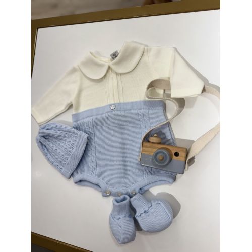 Brand: Pappa & latte. Pagliaccetto bicolore cielo e panna in misto Lana, cappellino e babbucce coordinate. 50% lana 50% acrilico. Made in Italy.