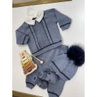 Completino 2 pezzi : maglietta con collo trapuntato blu, cappellino con pelliccia vera e babbucce coordinate. Effetto jeans con blu.
