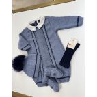 Tutina effetto jeans con collo bianco e trama blu. Cappello e babbucce coordinate.
