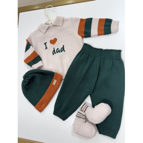Completino con maglietta con la dedicatoria I ❤️ Dad colore tortora manica a righe natural/verde bosco e arancione, pantalone verde bosco, cappellino e babbucce coordinate.