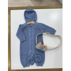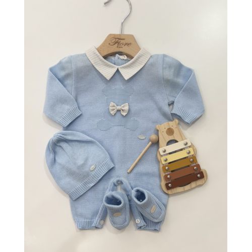 Tutina in filo di cotone cielo con colletto in tessuto con piccoli righe, orsetto centrale con piccolo papillon, cappello e babbucce coordinate. 100% cotone. Prodotto Artigianale.