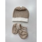 Completino in filo di cotone bianco e sabbia elaborato a costine con cappellino e babbucce coordinate. 100% cotone. Made in Italy.