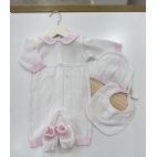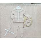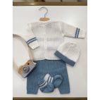 Completino in filo di colore bianco e carta da zucchero. Cappello e babbucce coordinate.