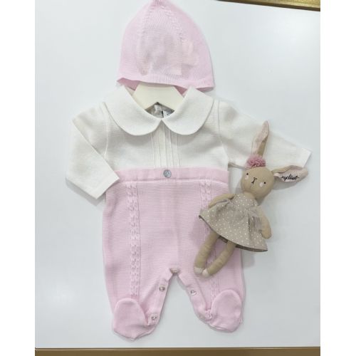 Tutina bicolore in filo di colore bianco e rosa e cappello coordinato. 100% cotone.