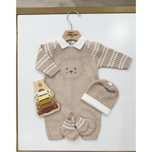 Tutina con leone in filo cotone, cappello e babbucce. 100% cotone.