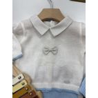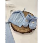 Completino Spezzato, maglia bianca manica lunga con orsetto con papillon, colletto a righe cielo e beige, bordino sia delle manica e vita cielo, pantalone cielo, cappello e babbucce. 100% cotone.