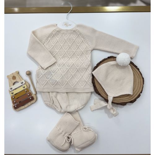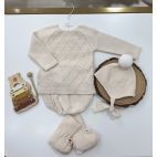 Completo 4 pezzi: maglia manica lunghe, cuolotta, babbucce e cuffia con piccolo pom pom. Colore: Natural.