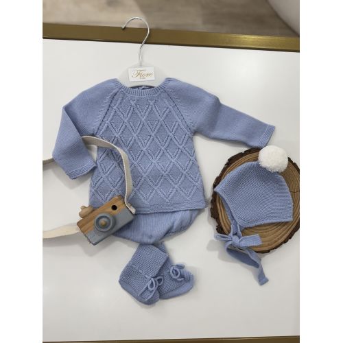 Comoletino 4 pezzi: maglia maniche lunghe, cuolotta, babbucce e cuffia. Colore: cielo. 60% lana 40% acrylic. Made in Spagna.