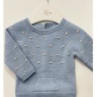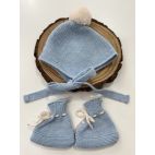 Completino 4 pezzi: Maglia maniche lunghe, cuolotta, babbucce e cuffia. Colore: Nube. 60% lana 40% acrylic.