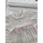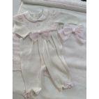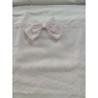 Brand: Minù . Uscita clinica romantica. Tutina bianca in filo di cotone con pizzo Rosa e fiocco al centro coordinata con la sua coperta sfoderabile.