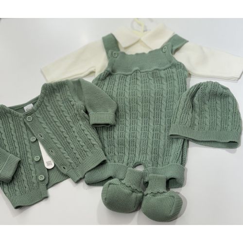 Brand: Pappa & latte. Pagliaccetto verde, maglietta bianco con colletto, cardigan verde, cappello e babbucce. Misto Lana. Made in Italy.