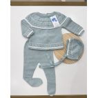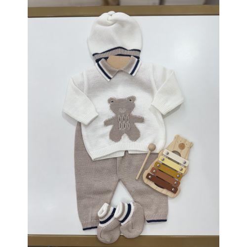 Completino spezzato con maglia bianca e colletto tortora con righa blu/bianca e orsetto centrale, pantalone lungo tortora, cappellino e babbucce coordinate. 100% cotone.