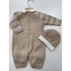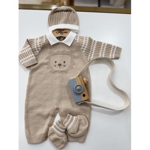 Tutina in filo di cotone colore sabbia con leone in petto e maniche con righe bianche, cappello e babbucce coordinate. 100% cotone.